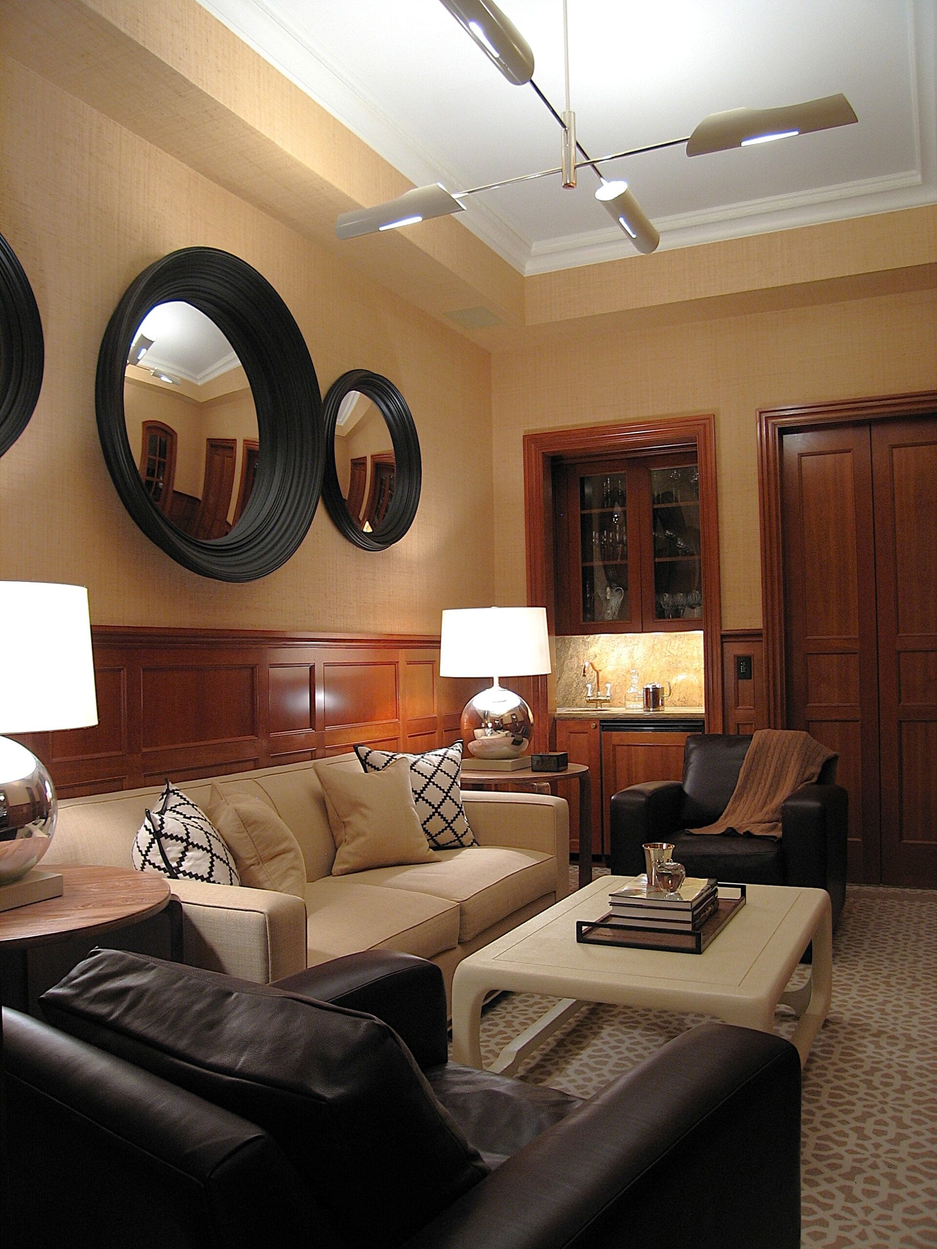 The interior design creates a tranquil and inviting space through the use of Phillip Jeffries grasscloth wall coverings and sumptuous fabrics on furniture and windows.