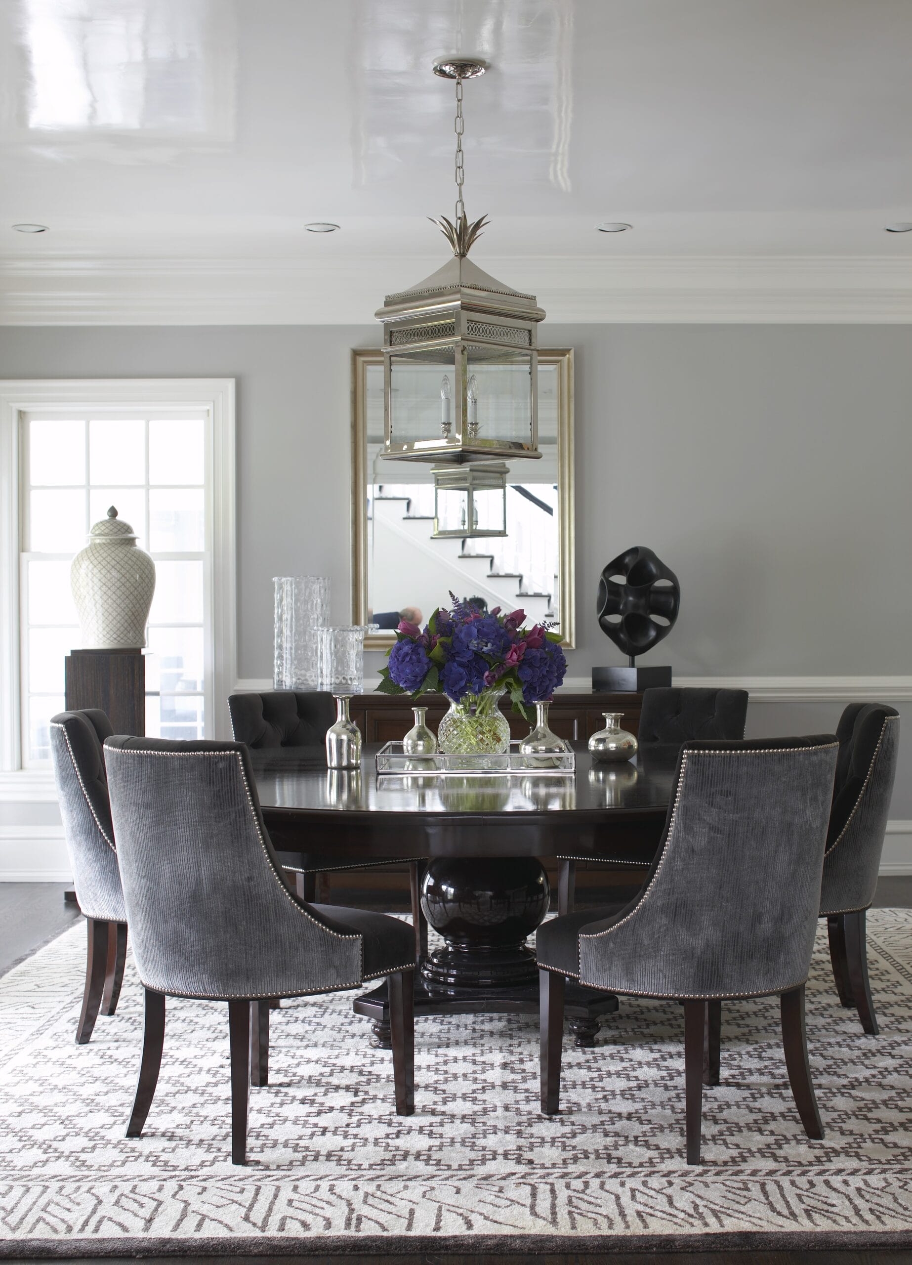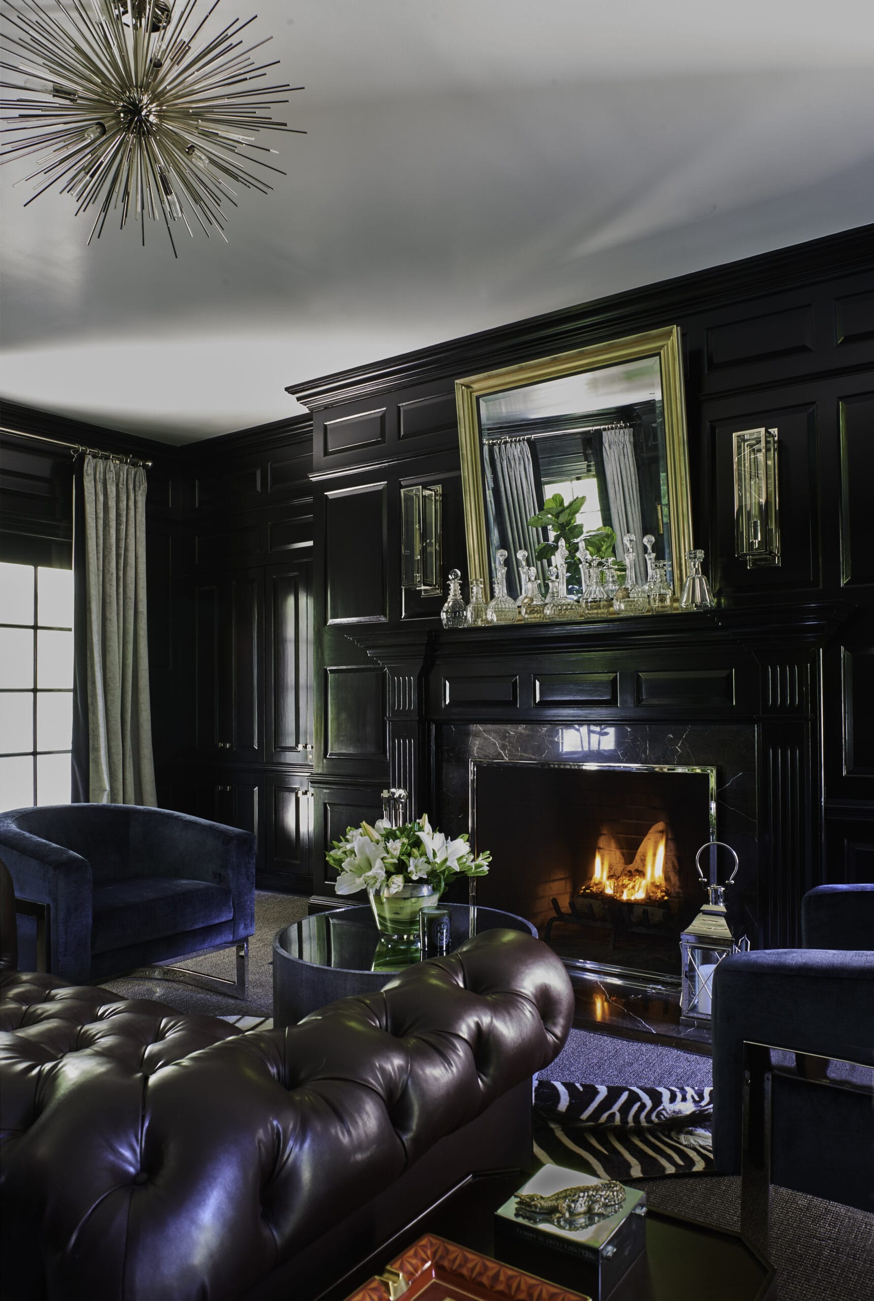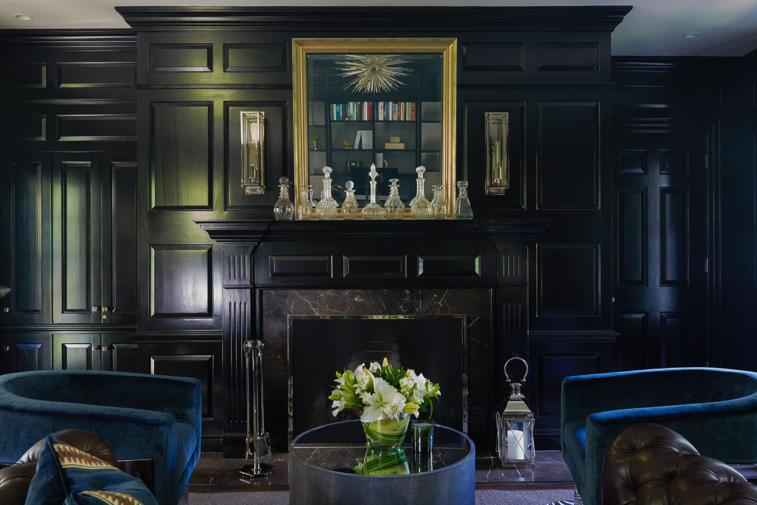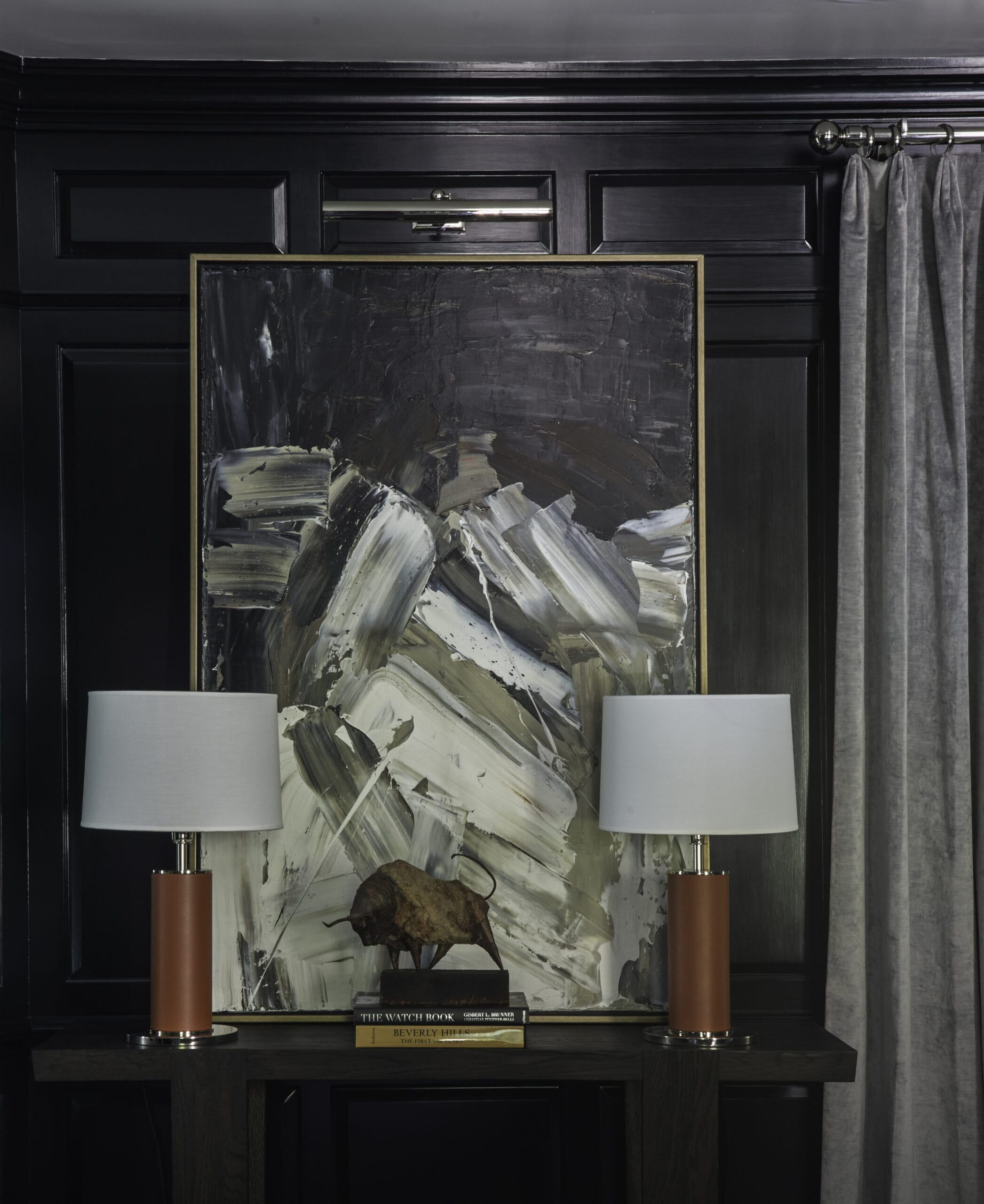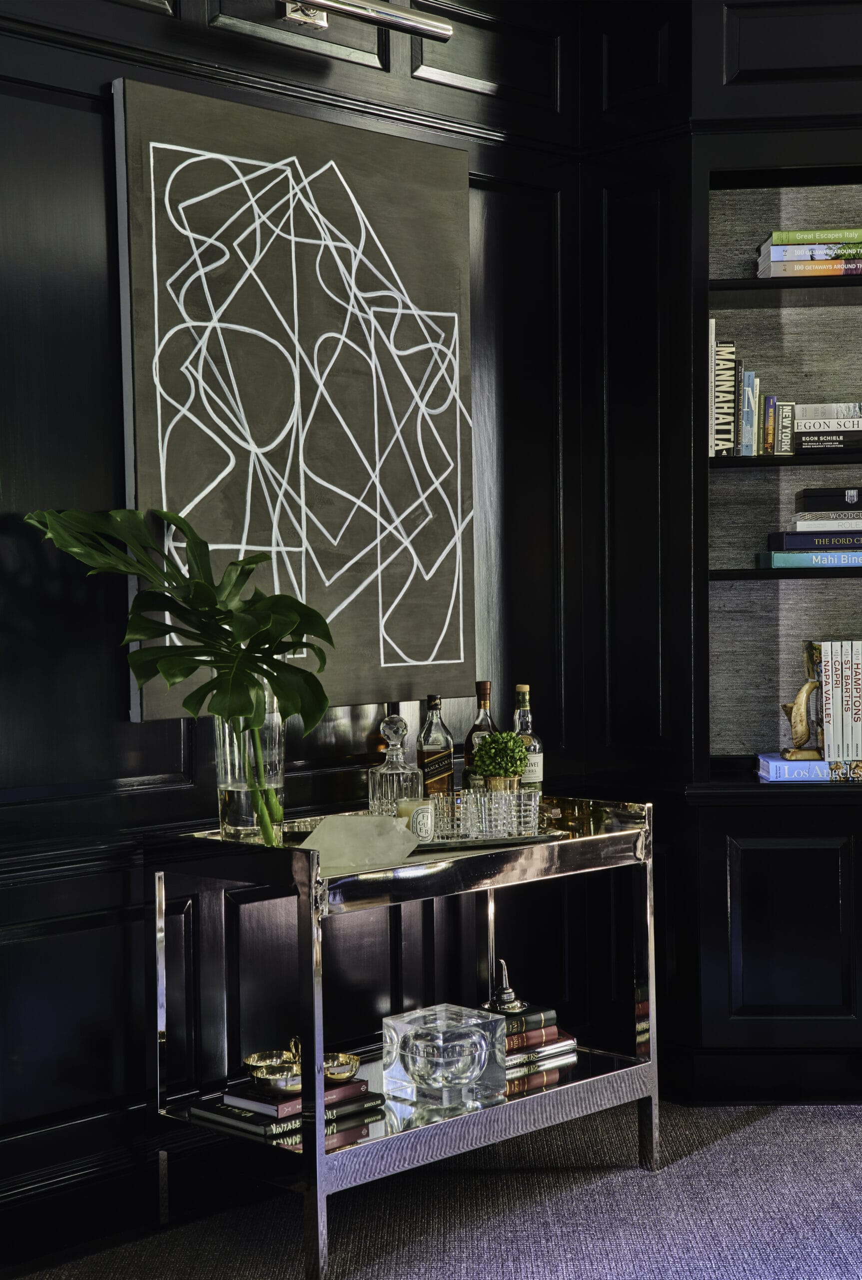 The study, a standout space that never fails to impress guests, boasts a chic black satin lacquer finish that adds a touch of drama and refinement. It’s a space that effortlessly combines form and function, serving as both a private retreat for focused work and a sophisticated setting for entertaining.